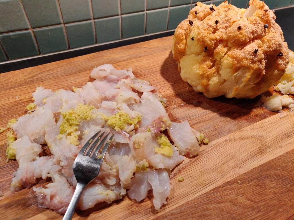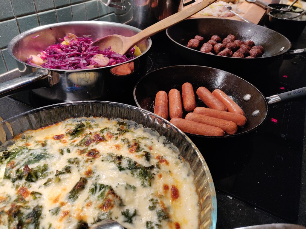 Förutom den traditionella skinkan, från en svensk välmående gris, så serverades ett griljerat blomkålshuvud, en blandad kålröra med både rödkål och brysselkål och en grönkålsgratäng som även innehöll spenat. Till detta några vegetariska köttbullar och dito prinskorv. Det blev mycket gott, alla var mätta och nöjda utan att hamna i paltkoma.
