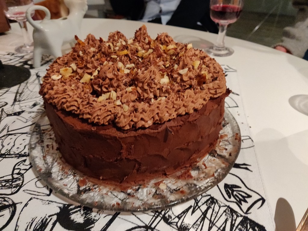 Efter promenaden idag tog jag en bit av den eminenta chokladtårta som sonen bakade igår, det var bara chokladbotttnar, chokladfyllning, chokladfrosting och chokladgrädde! Mmmm.