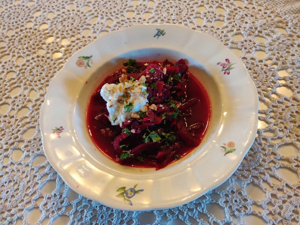 Gårdagens mat, som vi åt slut på i dag till lunch, var ett nytt recept på rödbets- och jordärtskockssoppa som jag hämtat från boken ”Recept som förändrar världen”. Boken var en ”gåva” från Postkodlotteriet och även receptet på rotfruktssoppa därifrån har testats och fått godkänt. Rödbetssoppan serverades med en pepparrotskvarg, som blev otroligt stark, och lite valnötter på toppen. Mycket gott.