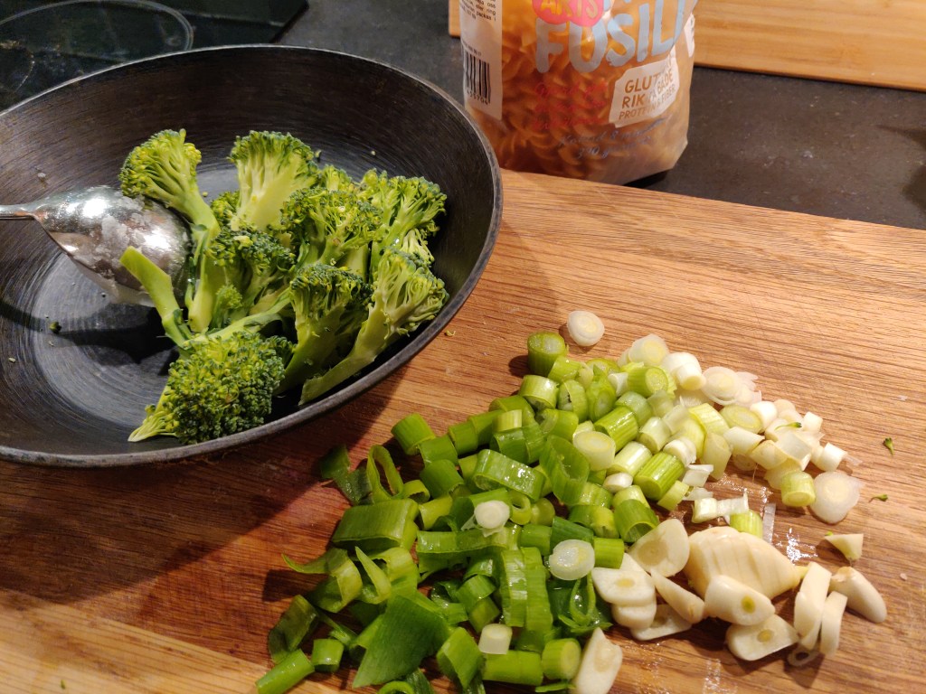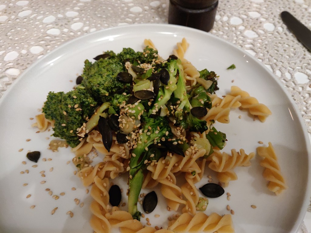 Till middag gjorde vi ikväll kikärtspasta med den grönkålspesto som fanns kvar, det var dock inte mycket trots att dottern gjort en väldigt stor mängd. Så rätten kompletterades med lite broccoli, salladslök, pumpakärnor och sesamfrön. Under gårdagen serverade dottern peston till hemgjorda sötpotatisgnocchi och det blev en fantastiskt god brytning.