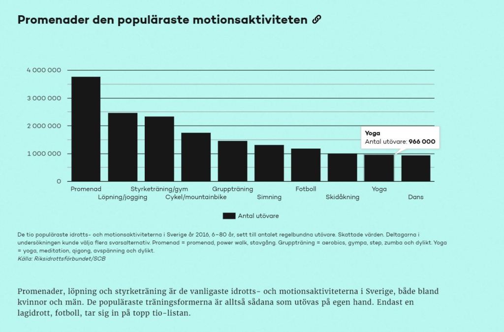 Yogan har tagit sig in på en nionde plats bland svenskarnas favoritmotion- och idrottsaktiviteter enligt Centrum för idrottsforskning.
