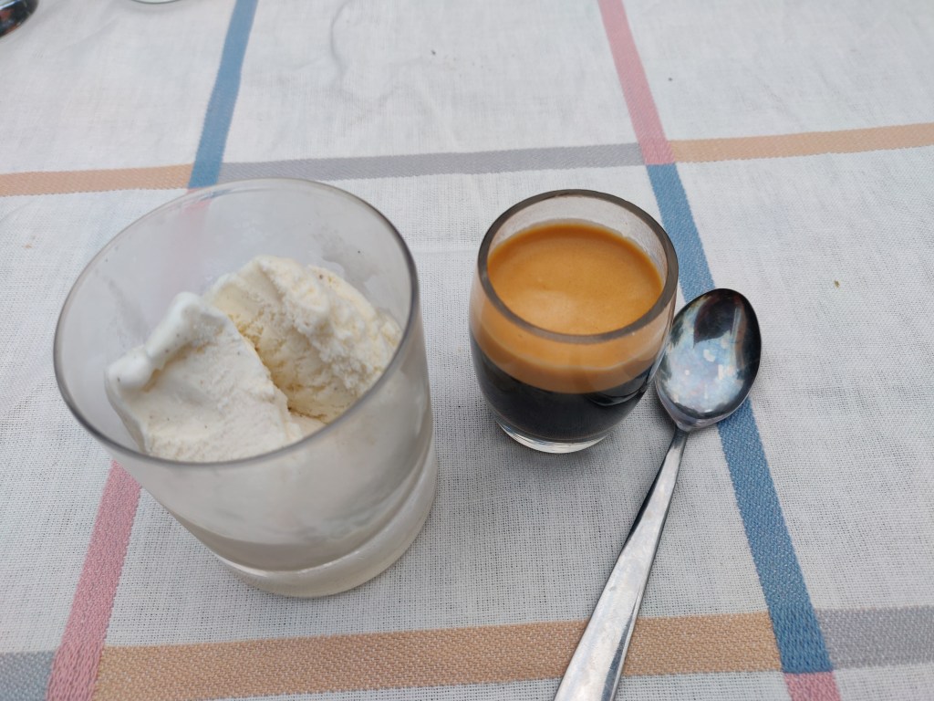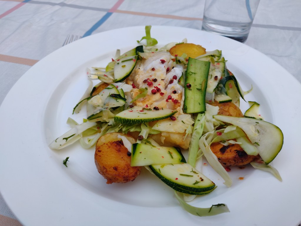 Ovan några bilder från kväll nummer två, så mycket gott att bilderna får tala. Kväll nummer tre ser du nedan, den bestod av en fint foliebakad torskrygg med picklad gurka och rosépeppar och en liten trendig dessert med glass dränkt i espresso.