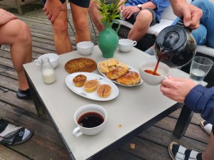 Förutom all den från grunden lagade hälsosamma maten, så blev det ett avsteg. Inköpt fikabröd från Rådmansö bageri. Till och med jag, som faktiskt vanligtvis inte är ett dugg sugen på söta kakor, lät mig väl smaka av dessa delikatesser. Det måste ha varit det mysiga sällskapet.