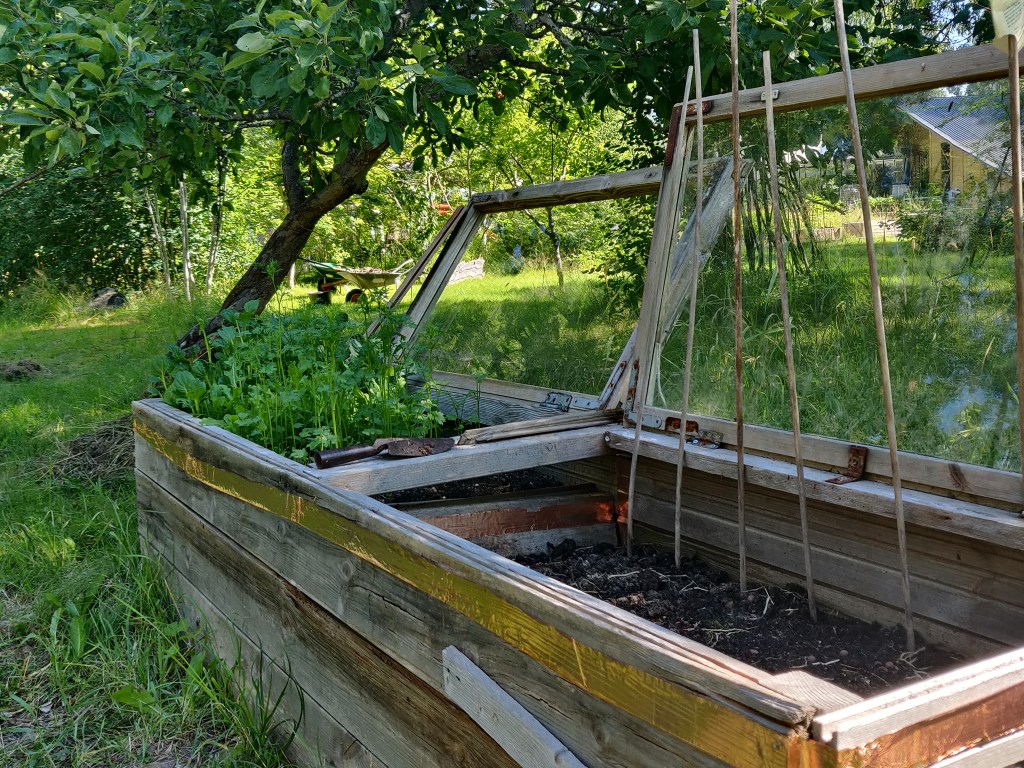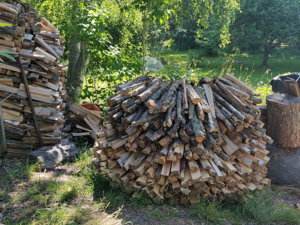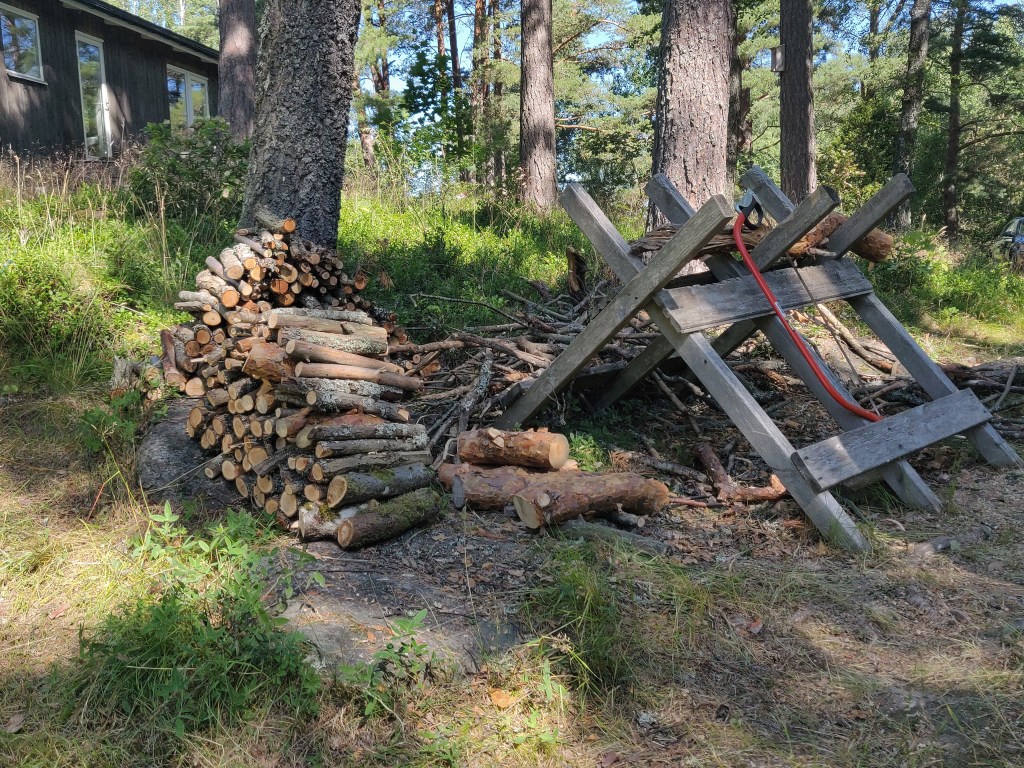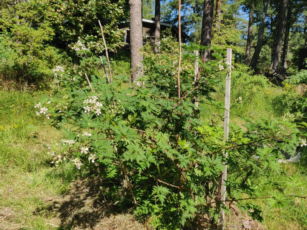 Björnbärsbusken blommar,körsbären börjar mogna,krusbären likaså.Tvätten hänger på lina,nästan all ved är sågadoch staplad snyggare än någonsin.Elden har brunnit ut och ris och plank brunnit upp,det växer i lådan med koppartejp,men timjan och popcornmajs vill inte gro.Några kantareller till kvällens lubboch smultron med glass från Tre vänner (den bästa)och så ett och annat bad förstås.