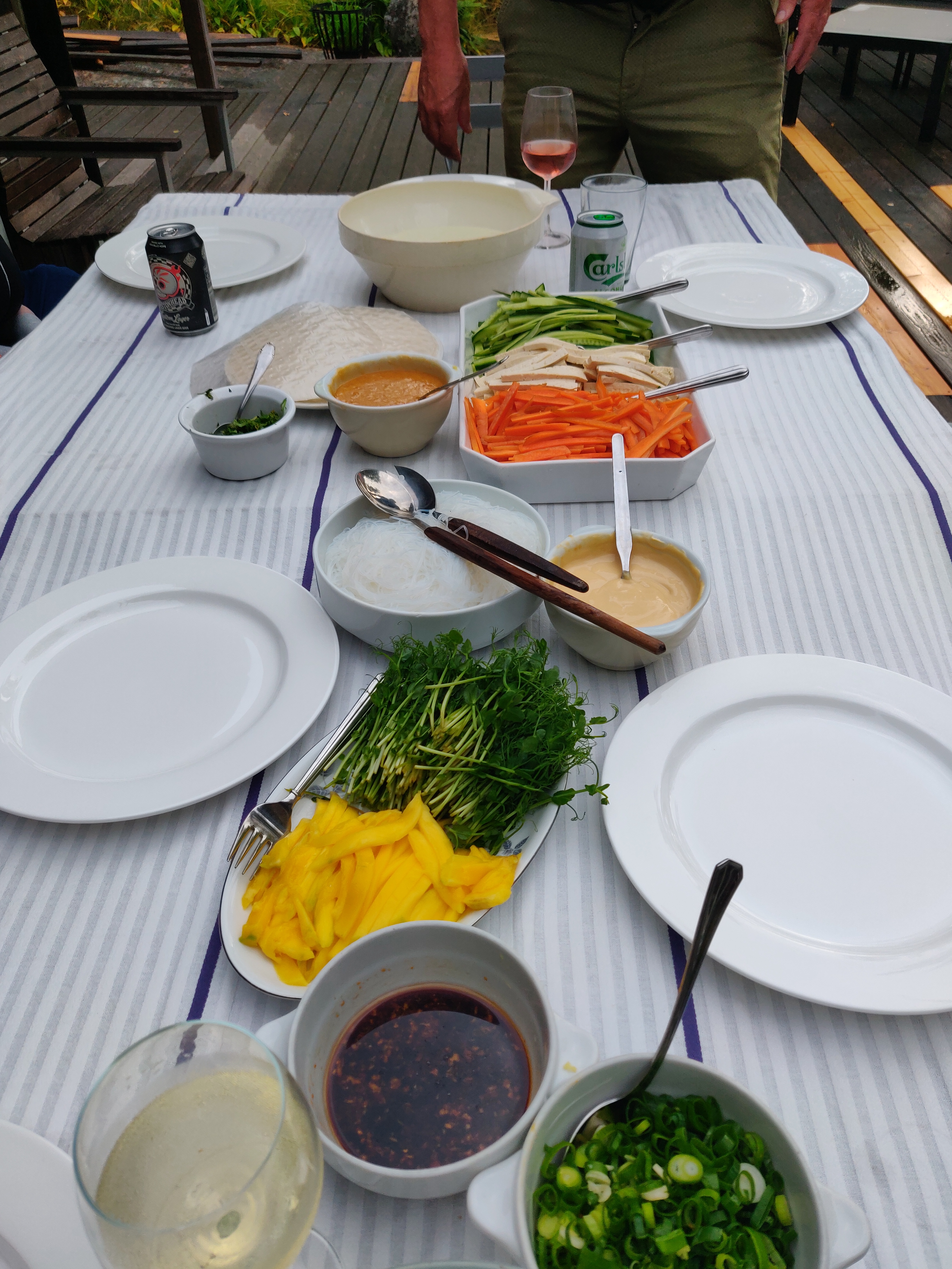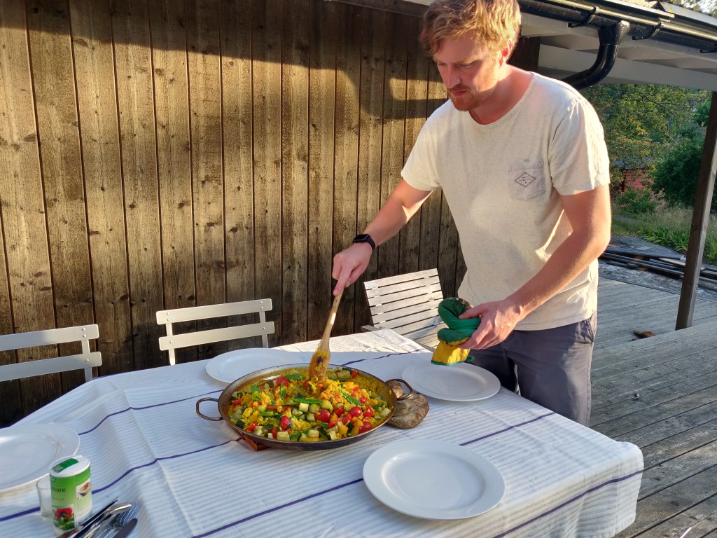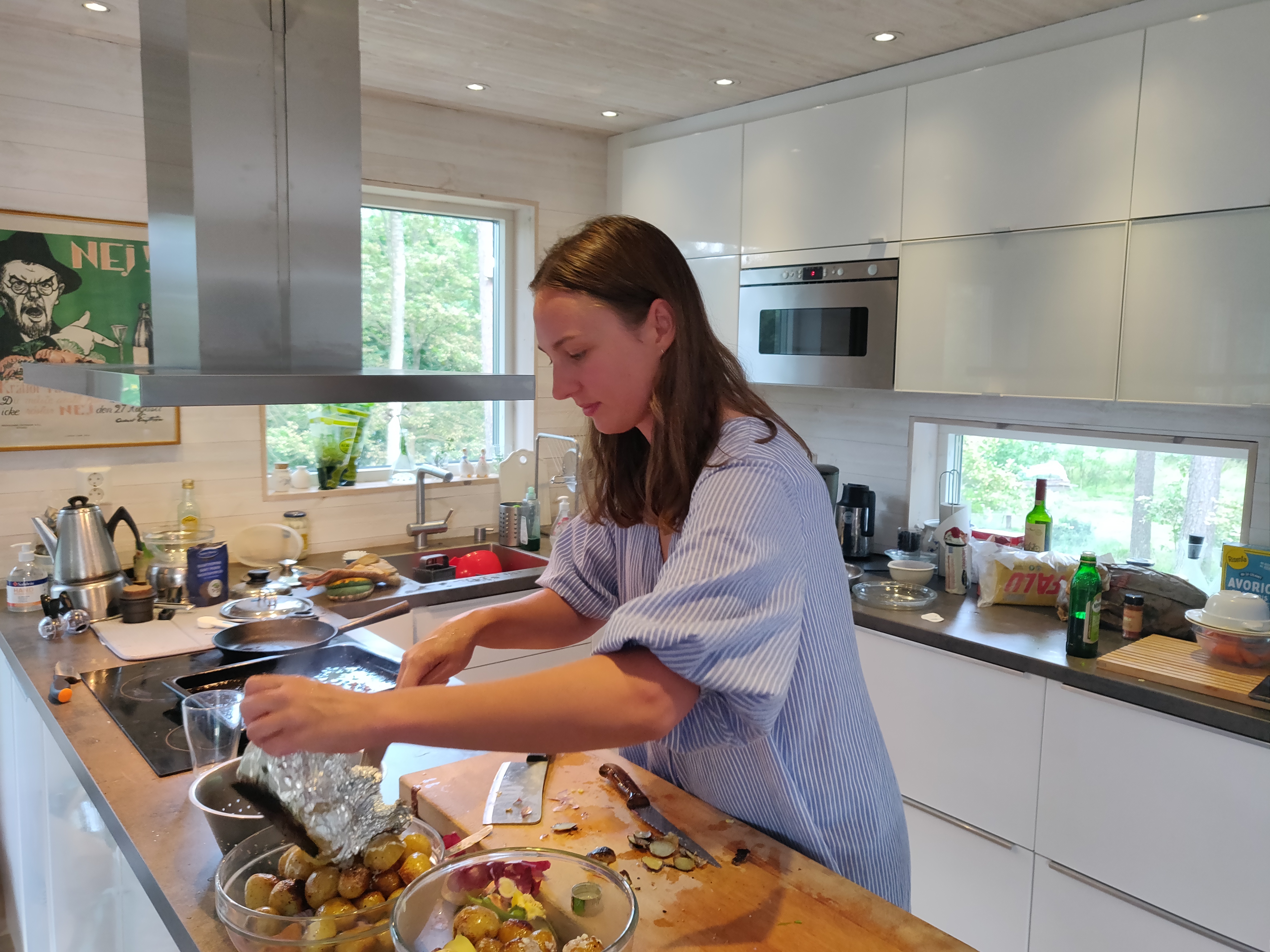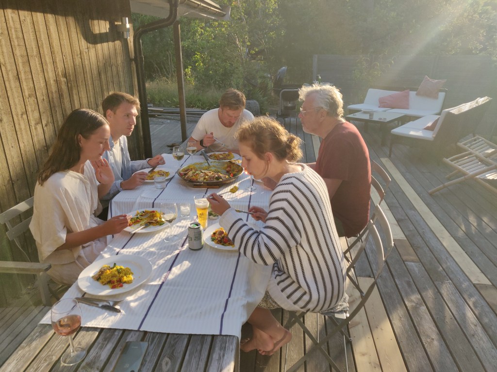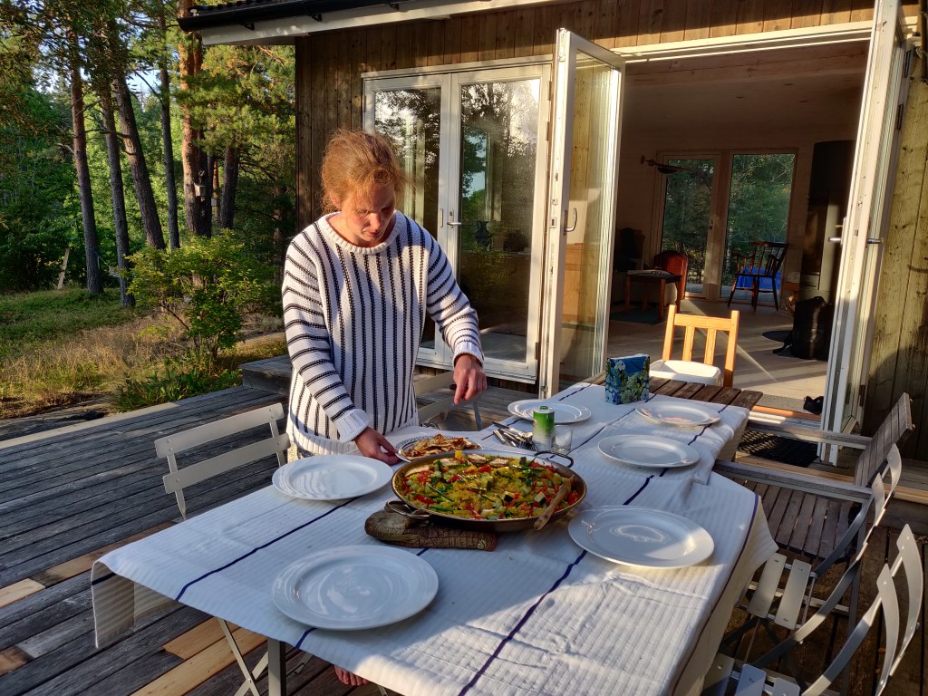”Barnen” turas om att skapa delikata måltider, farmor är volontär för barnpassning och försöker hålla undan disken. En riktig ”slow” vecka, då dock en del böcker hann läsas. Men mestadels skönt häng och umgänge i ett soligt Roslagen.